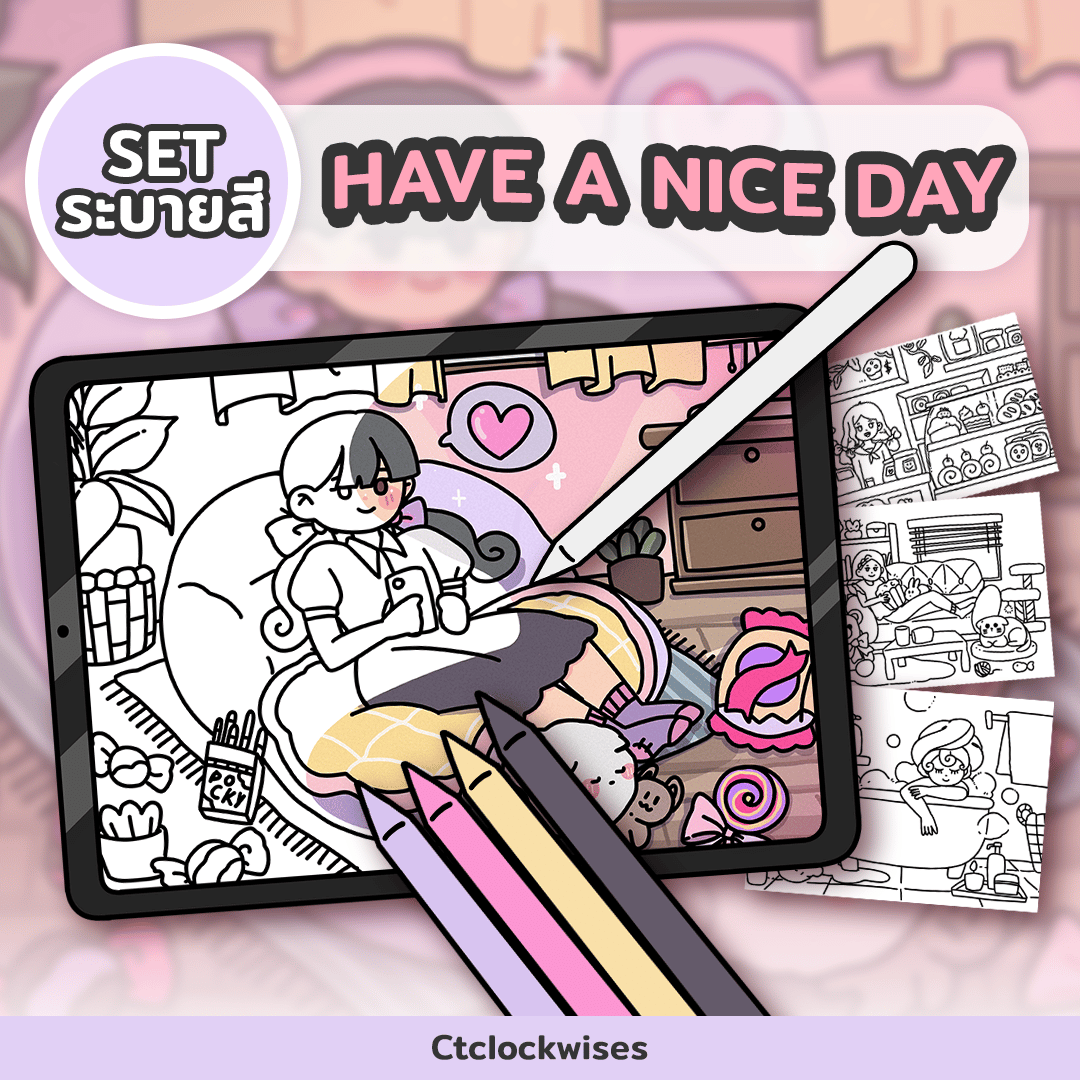 ภาพลายเส้นน่ารัก กับเหล่าสายวน้อยในวันดีๆ ที่อยากจะให้ทุกคนมีวันที่ดี HAVE A NICE DAY ไปกับภาพระบายสีเซ็ตนี้ 🍀