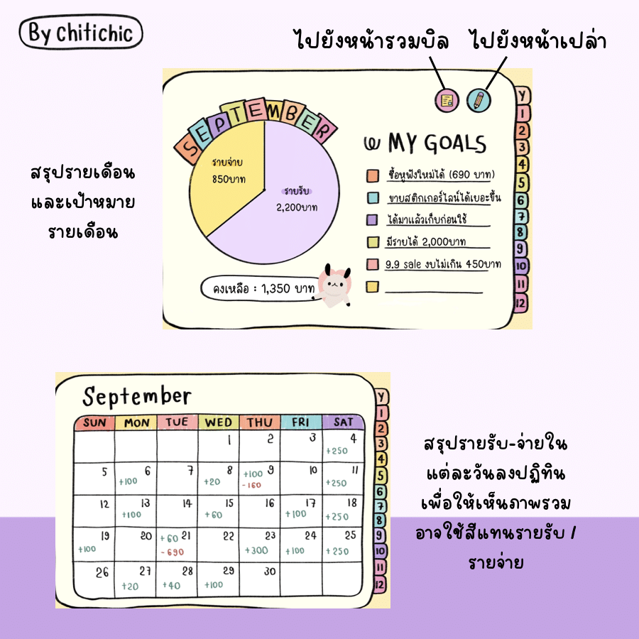 น้องจะเป็นสมุดบันทึกรายรับรายจ่ายงับ มาพร้อมกับหน้าปกปกสุดคิ้วท์ มีทั้งหมด 72 หน้า และมี Hyperlinkให้ทุกหน้าเยย