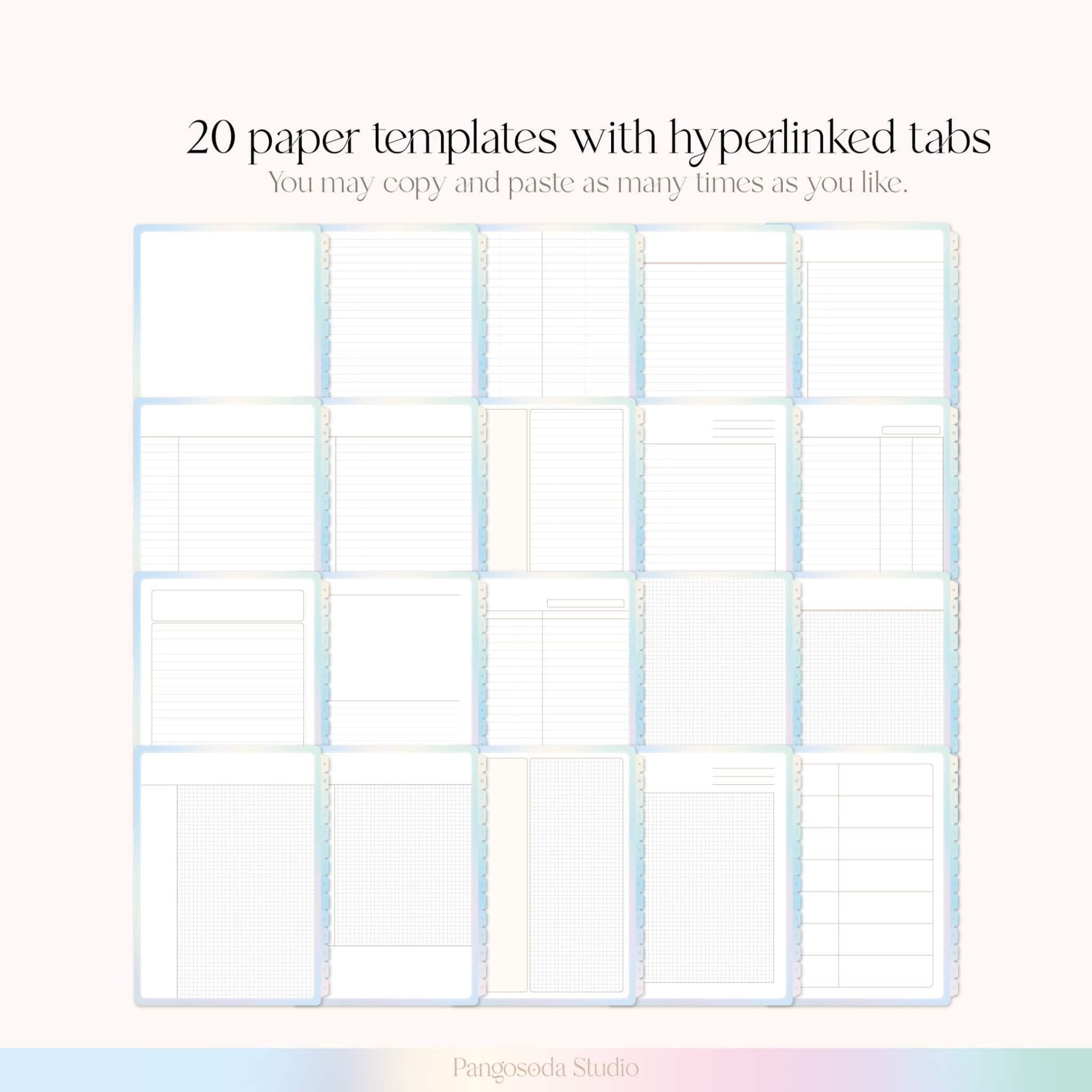 -Choose from 20 different paper templates. you can copy and paste to wherever you want in the notebook (as many times as you want).