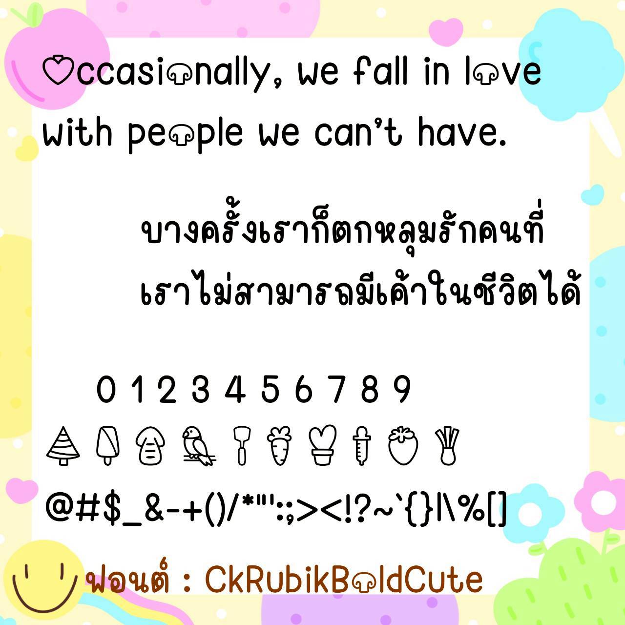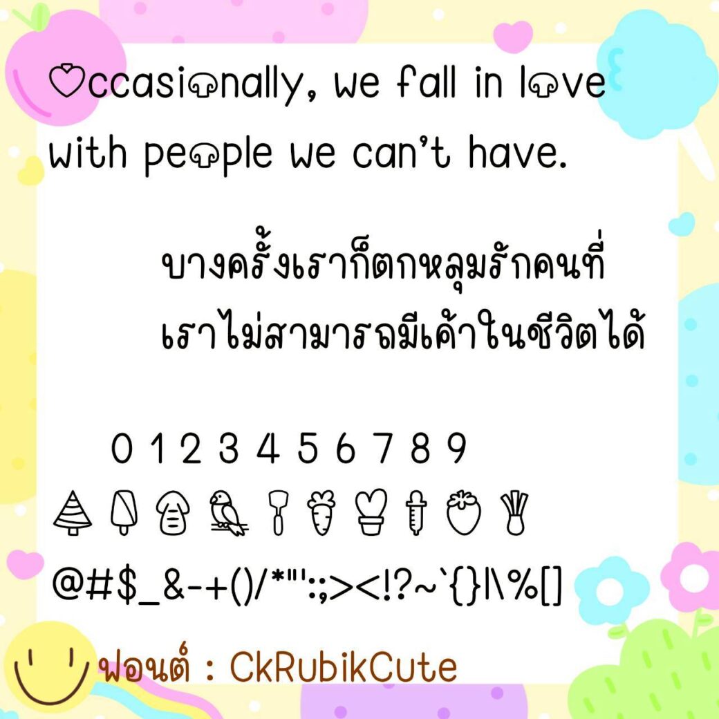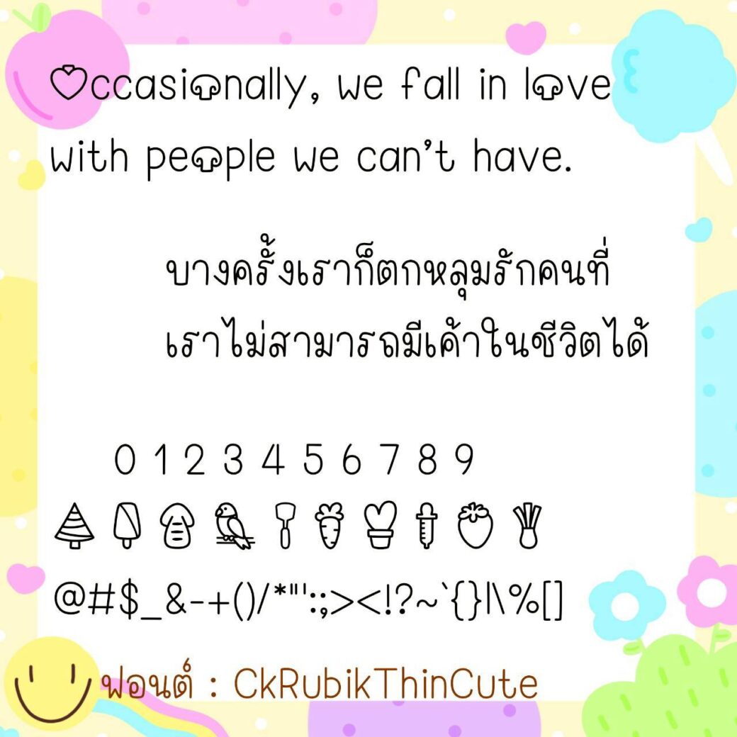🔹 A cute, youthful, long-handled font. The size is just right, not too big or too small. It has a slightly cursive handwriting style, but is still easy to read. It also includes cute emojis that can be used to replace Thai numerals. 🥰💙