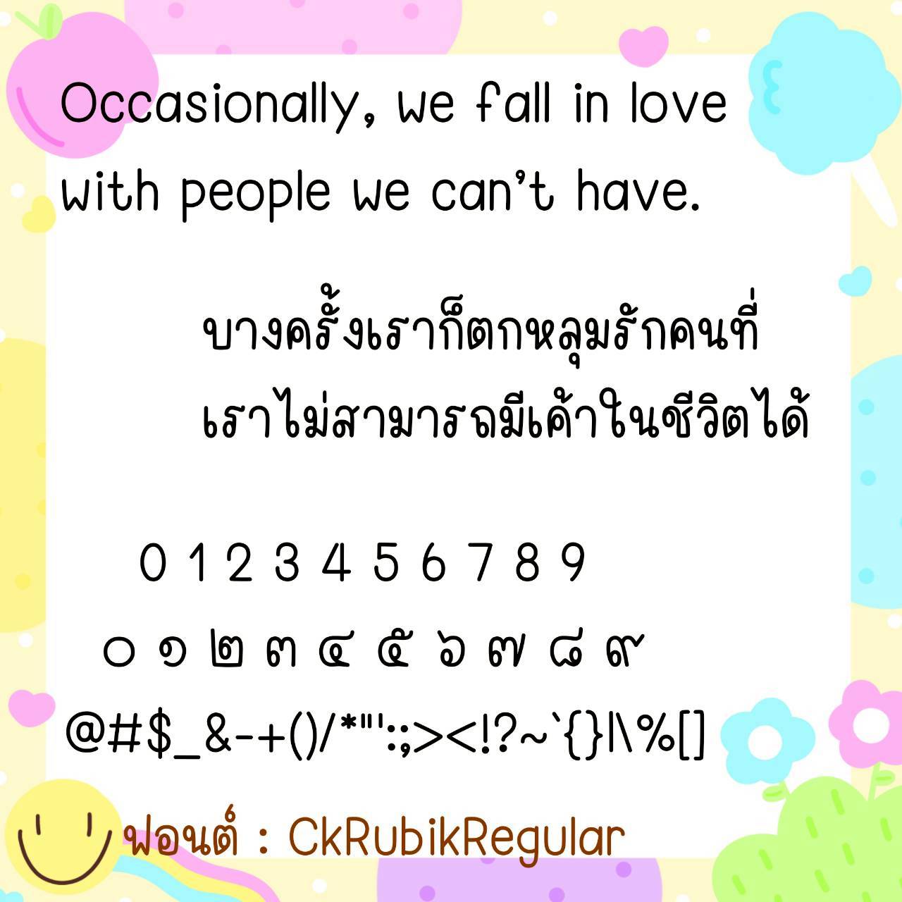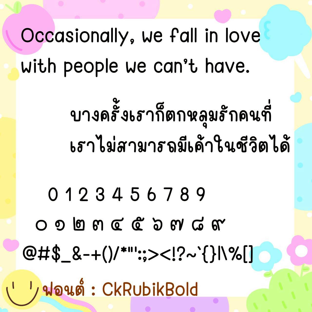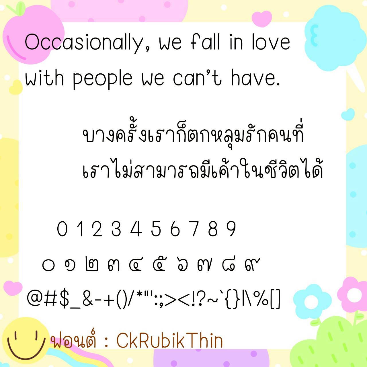🔹 A cute, youthful, long-handled font. The size is just right, not too big or too small. It has a slightly cursive handwriting style, but is still easy to read. It also includes cute emojis that can be used to replace Thai numerals. 🥰💙
